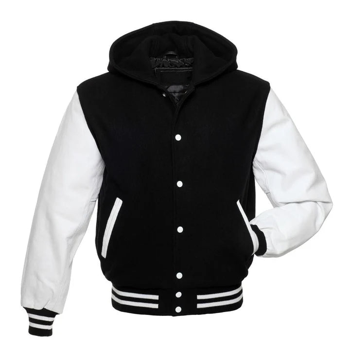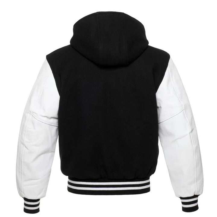 Black Hoodie Varsity Jacket With White Leather Sleeves