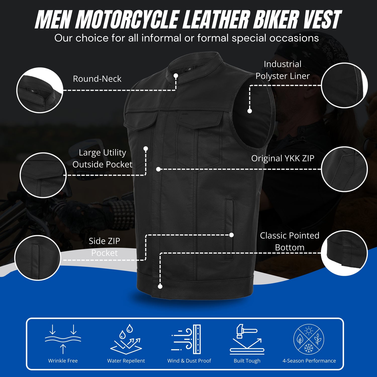 - Outlaw style vest design with double stitched accents