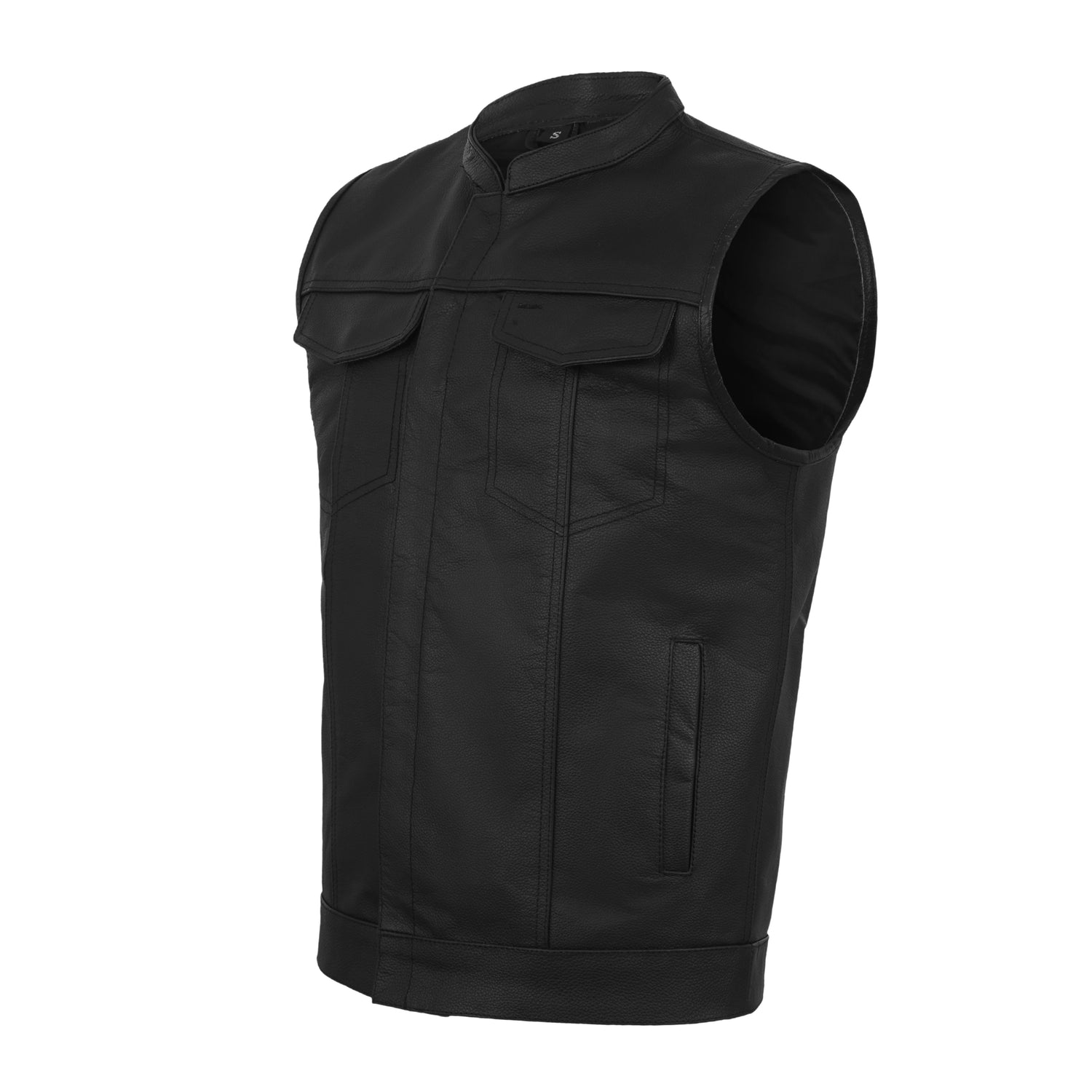 Zipper & Snap closure Brotherhood Leather Vest is one of our finest Vests offered. It is the best fitting Outlaw style Vest in the marketplace. It is inspired by classic denim motorcycle vests, as well as the SAMCRO Club Vest worn on the hit series "Sons of Anarchy" on FX Networks. We use a heavier, finer grade cowhide leather and the main snaps are hidden on the front panel & chest pockets. It features two custom designed interior gun pockets large enough for a full size Colt .45 ACP.