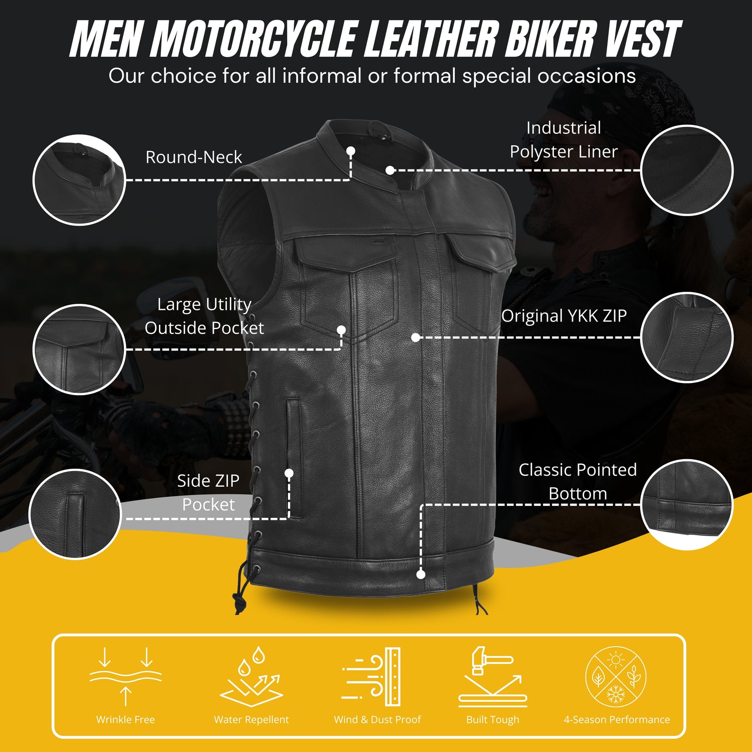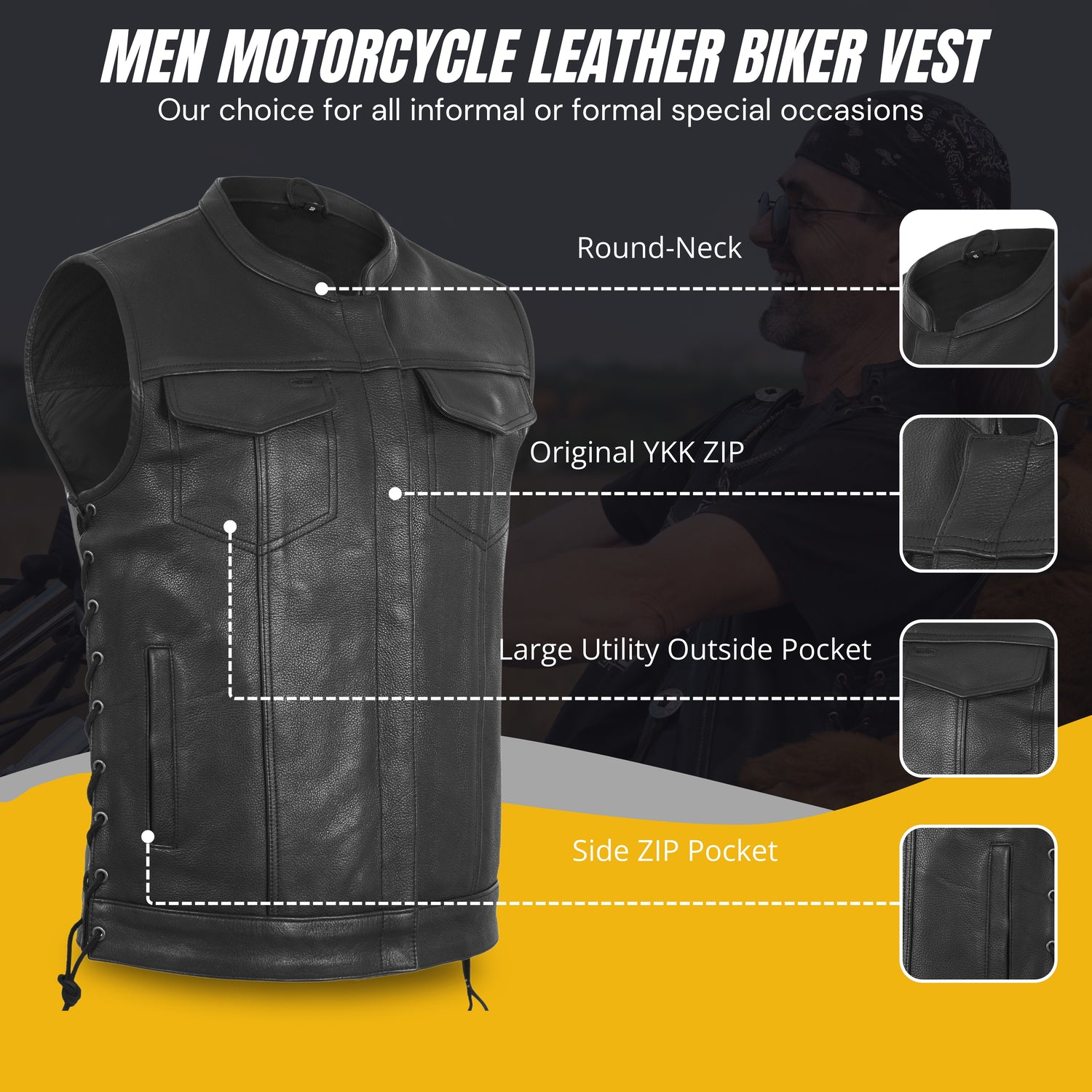 ✅ Stuff & Composition: Men’s leather motorcycle club vest made of 1.1-1.2 mm most premium leather. Featured with banded collar and cropped center zipper hidden with covered snaps.