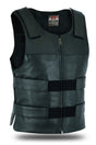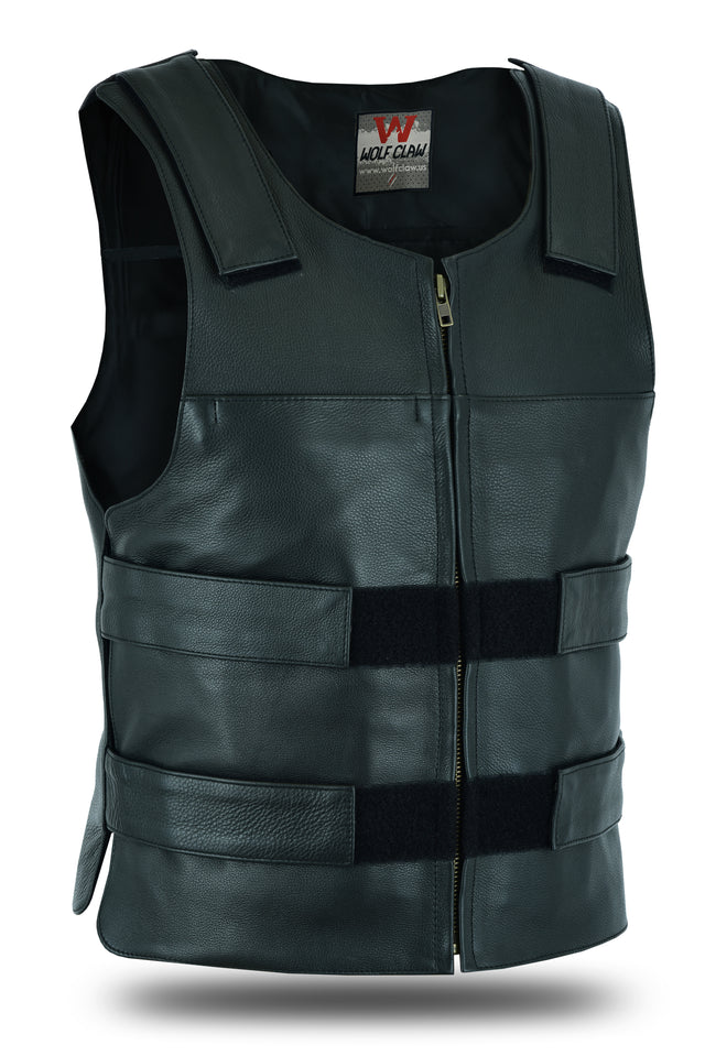 Men's Black Zippered Bulletproof Style Tactical Street Vest offers the same attention to detail as our standard bullet proof style model with an added Front Zipper.  Large panel back makes it easy to add the largest club colors, patches or custom embroidery. Adjustable leather straps at shoulders for length, waist and chest for varying sizes. The adjustable sizing makes it a perfect for wearing over a shirt or even a heavier jacket. Ponytail lined with two inside zippered pockets. This vest can also isolate cell phones and other sensitive electronic devices from engine vibration and road shock with its exclusive breast pocket