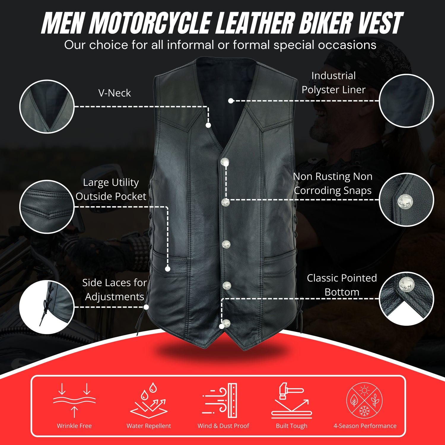 Men's Black Side Lace Basic Style Motorcycle Leather Vest.
