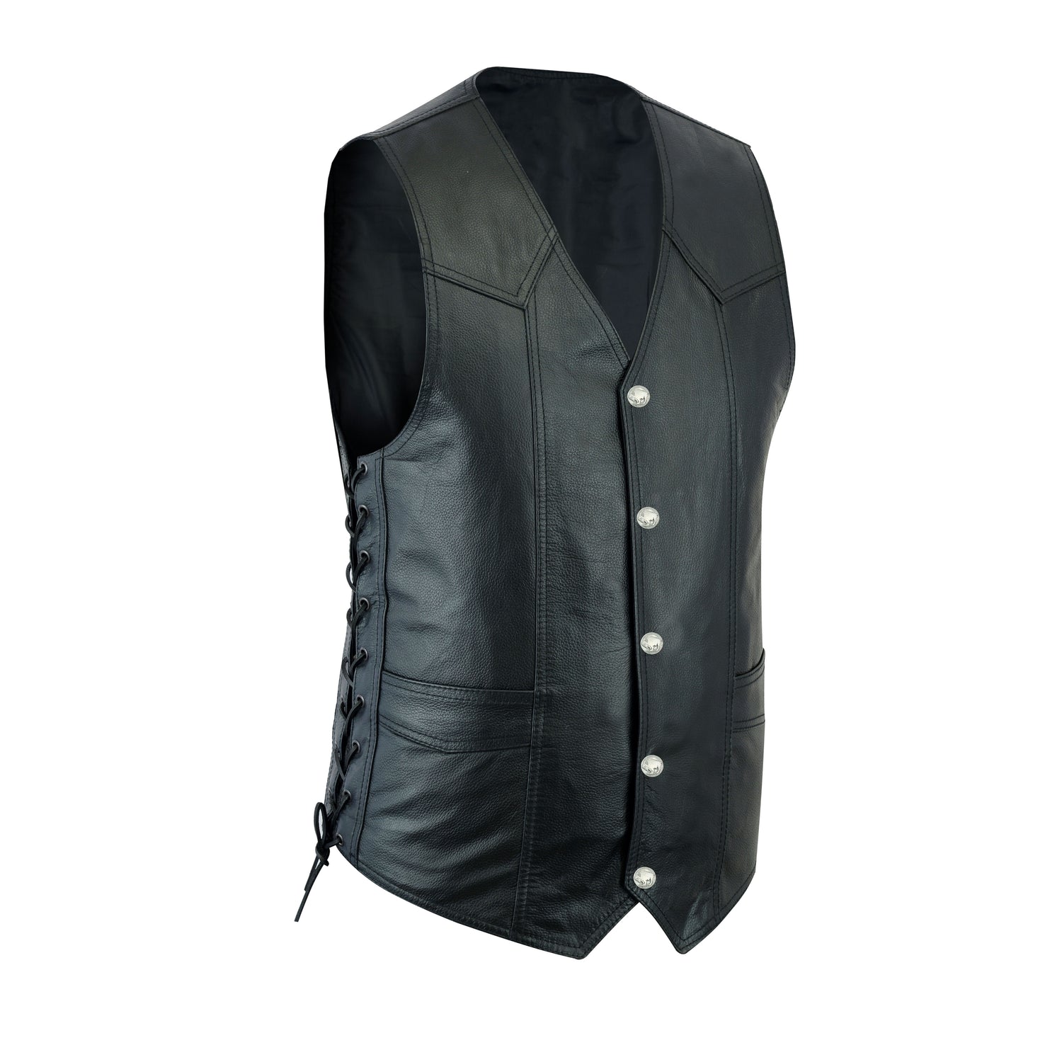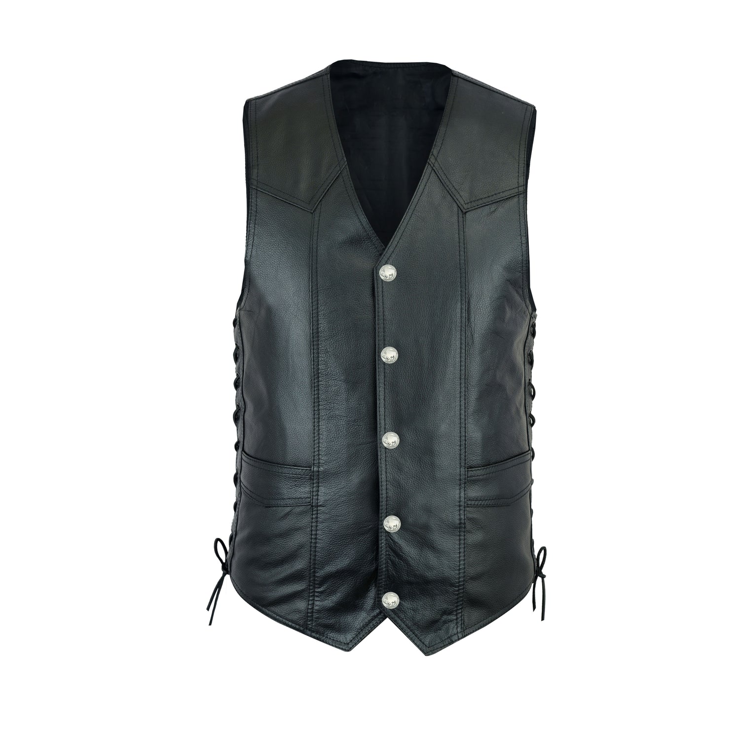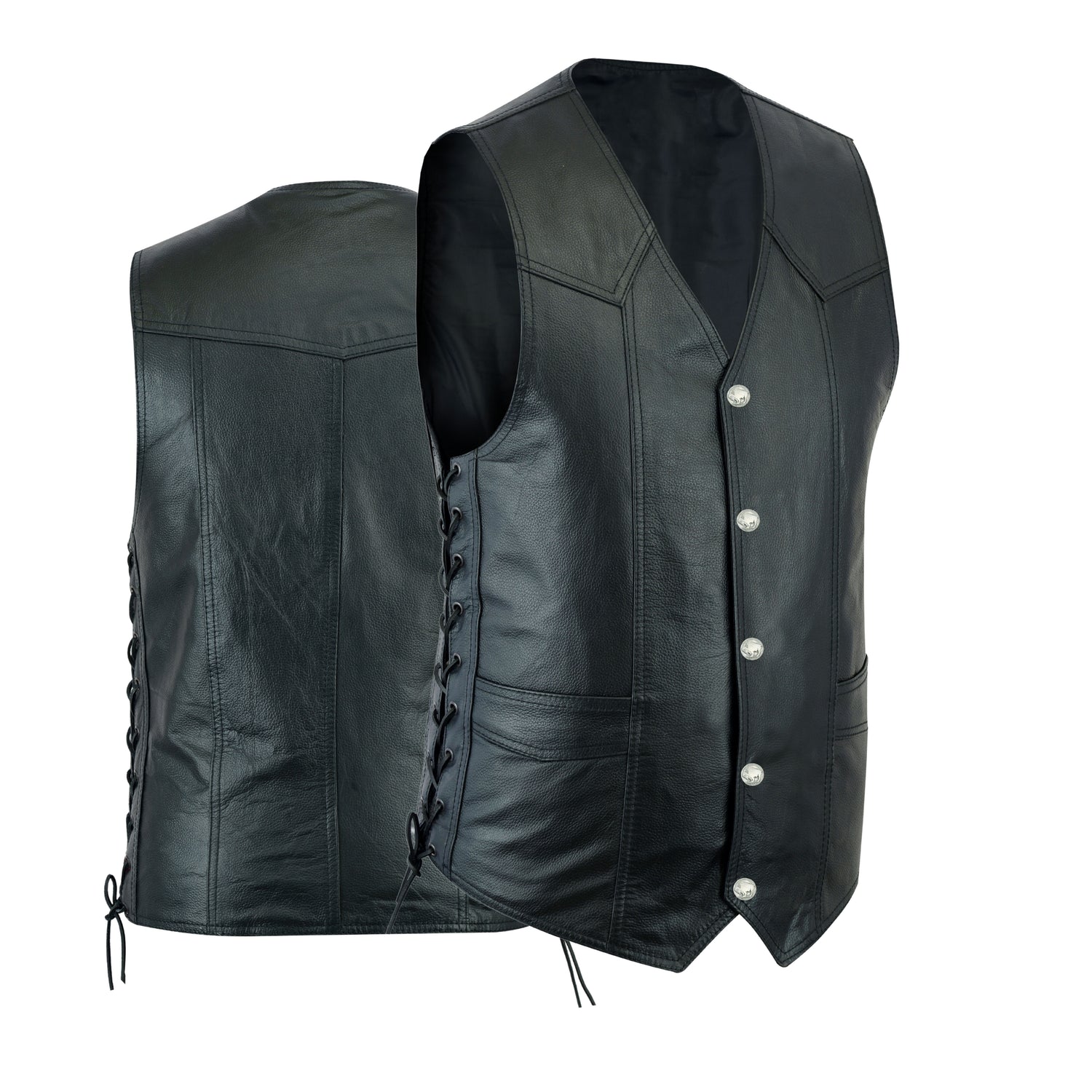 Men's Black Side Lace Basic Style Motorcycle Leather Vest. - XS is backordered and will ship as soon as it is back in stock.
