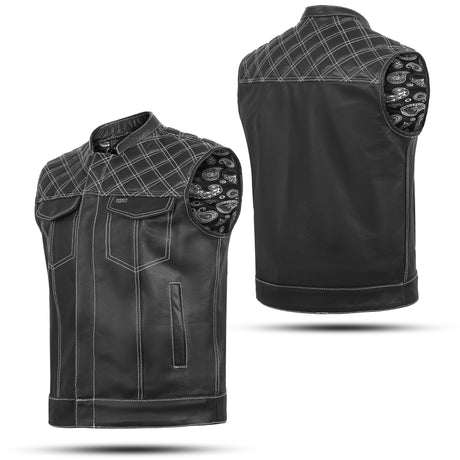 Men's White Black Cross Stitch Club Style Cow Platted Milled Leather Vest.