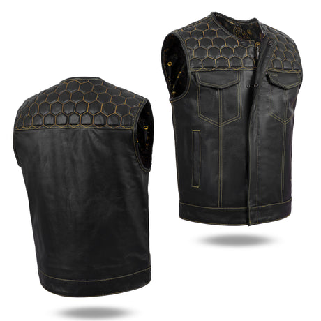 Men's Yellow Black Cross Stitch Club Style Cow Platted Milled Leather Vest.