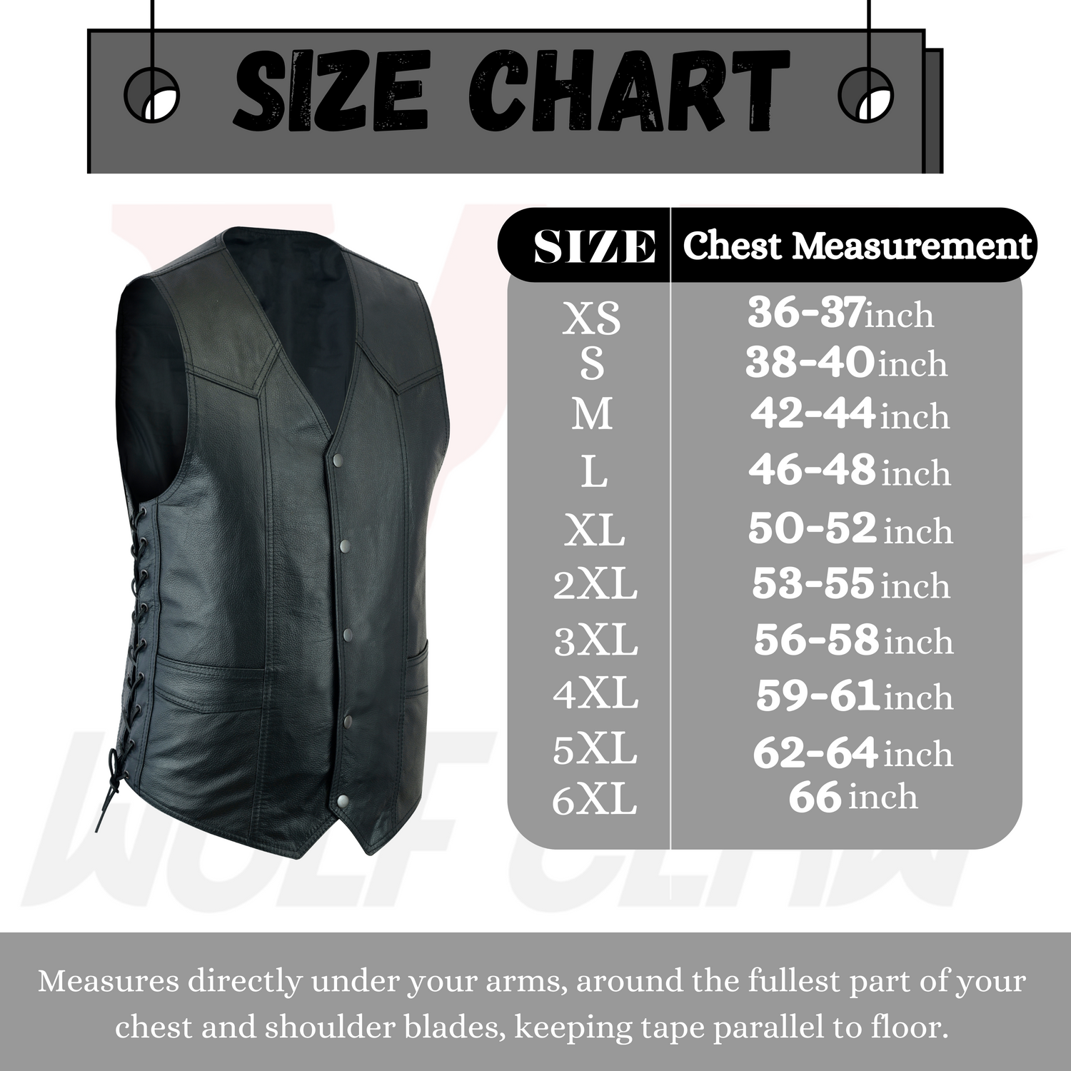 Men's Black Side Lace Basic Style Motorcycle Leather Vest. - XS is backordered and will ship as soon as it is back in stock.