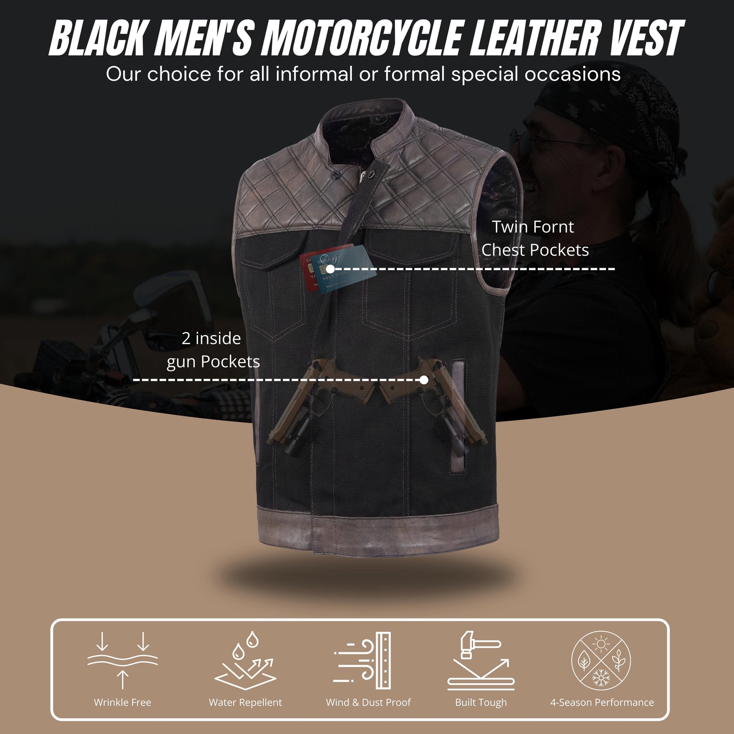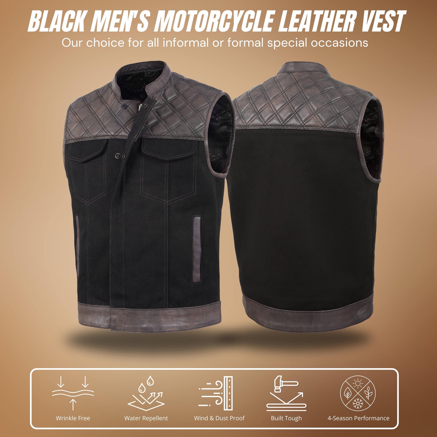 Men's Distressed Brown Black Cross Stitch Club Style Denim Vest. - S is backordered and will ship as soon as it is back in stock.