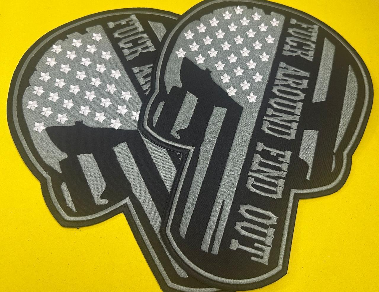 WCEP13 SKULL WITH DARK GREY STRAPS (F**K AROUND MOTORCYCLE PATCH EMBROIDERY IRON ON PATCH is backordered and will ship as soon as it is back in stock.