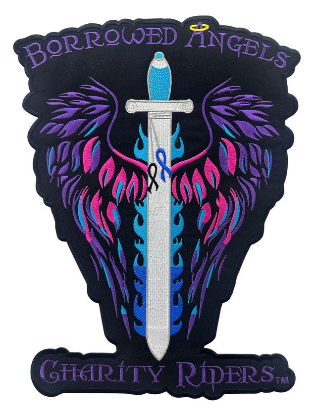 WCEP157Angel BORROWED ANGEL - CHARITY RIDERS LARGE EMBROIDERY PATCH - SWORD AND ANGEL WINGS PATCH IRON ON - SEW ON FOR MOTORCYCE RIDERS, BACK PATCH is backordered and will ship as soon as it is back in stock.
