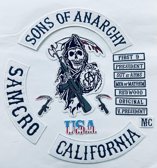 Show off your style with this high-quality SONS OF ANARCHY biker embroidery patch, perfect for customizing jackets, vests, backpacks, and more. Crafted with vibrant threadwork and a durable fabric base, this patch features a skull holding sword, Phrases _ SONS OF ANARCHY, CALIFORNIA, SAMCRO) in blue and white color. Apply it easily using an iron-on backing/sew-on or both, and instantly upgrade your gear with personality.