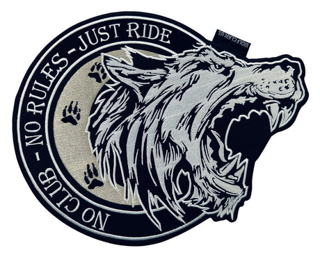 WCEP67 NO CLUB-NO RULES-JUST RIDE WITH WOLF FACE DESIGN MOTORCYCLE PATCH EMBROIDERY IRON ON PATCH