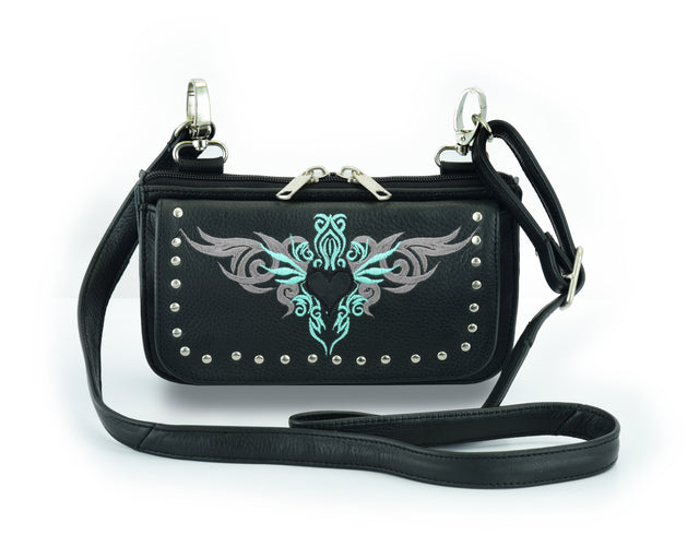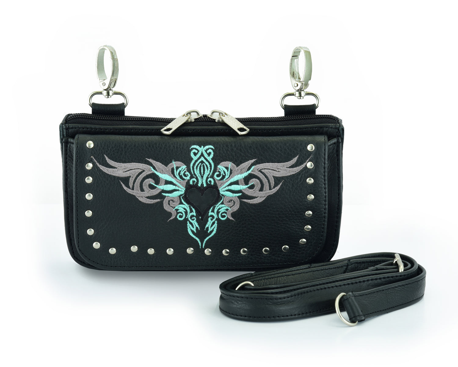Biker Teal Embroidered Tribal Heart Hip Clip Leather Bag