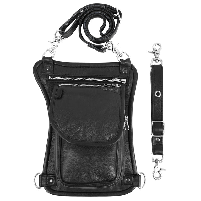 Adjustable Strap, 100% satisfaction guarantee warranty, Multipurpose use: Universal Gun Holster w/ Position Adjustment., used as a drop leg bag, thigh pack, waist pack, cross body bag,, Built In Media Storage Pocket w/ Cell Phone Holster/Wire Feed,, Magnetic Closure Gun Holster Pocket, Durable, good construction,, Size: Main Pocket 9.5” x 6.5” x 2”. Bonus 7” x 9” Deep Storage Po, Two Bonus Zipper Close Pockets, Durable & Premium Cowhide Leather Drop Leg Bag:, made of water-resistant leather,, top-quality zippers, and adjustable straps, ideal for motorcycle, bike, riding, cycling, travel, outdoor adventures