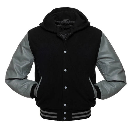 Black Hoodie Varsity Jacket With Grey Leather Sleeves