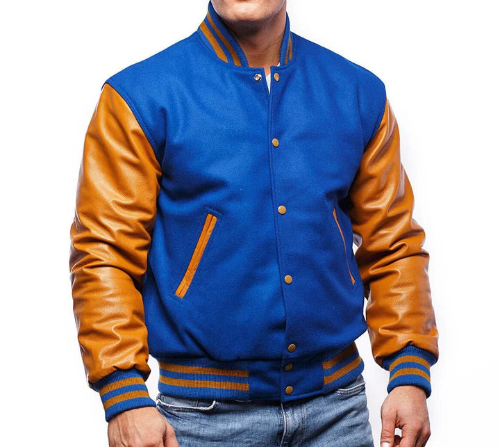 Introducing the Blue & Gold Leather Sleeves Varsity Jacket, a masterpiece that seamlessly blends style and comfort. This jacket is your passport to stand out from the crowd and leave a lasting impression. Here's why you need to make it yours: