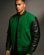 Men’s Green Wool and Leather Letterman Jacket with Ribbed Cuffs
