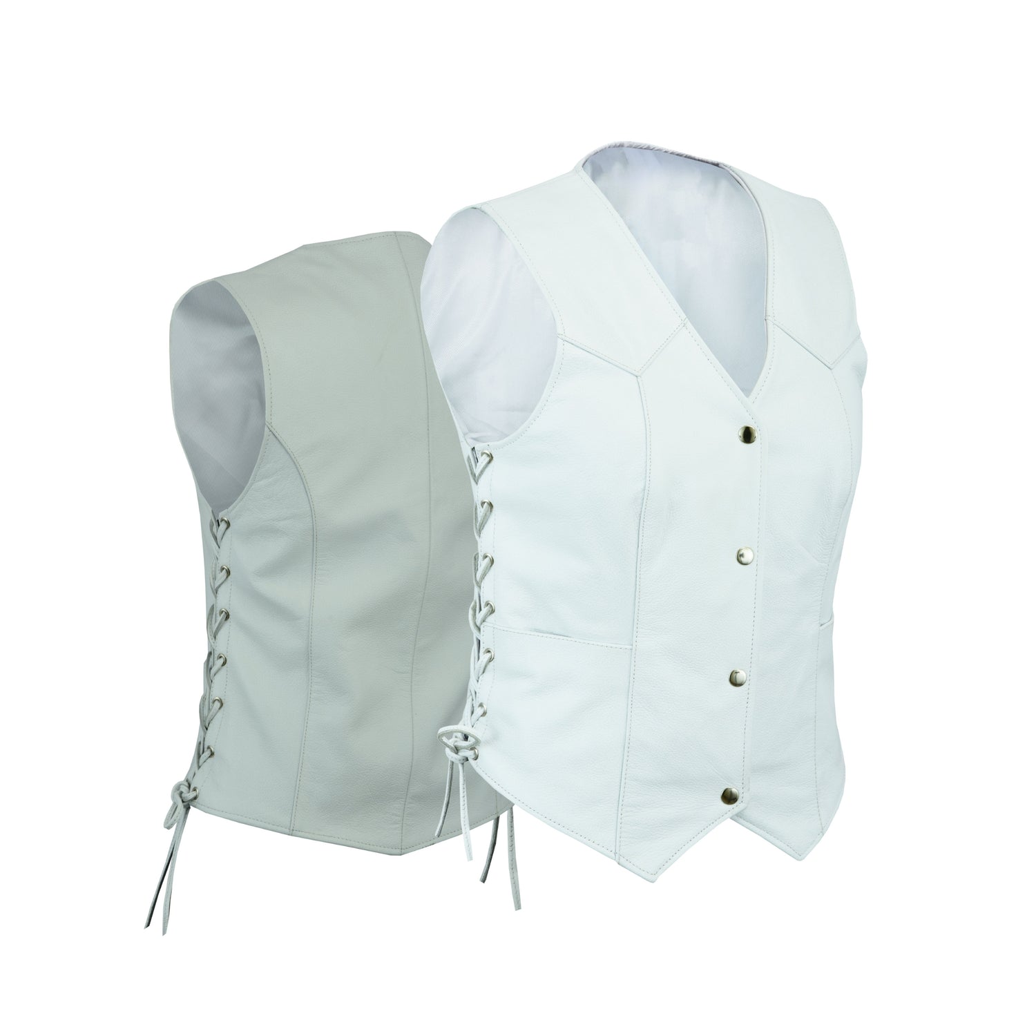 Add a little girlish charm to your biker wardrobe - White Leather Motorcycle Vest is the perfect garment to add some pizzazz to your riding gear. Crafted from Genuine Quality White Dyed Leather, this classically-tailored ladies' motorcycle vest shows off your shapely curves in an ultra-feminine shade of white.