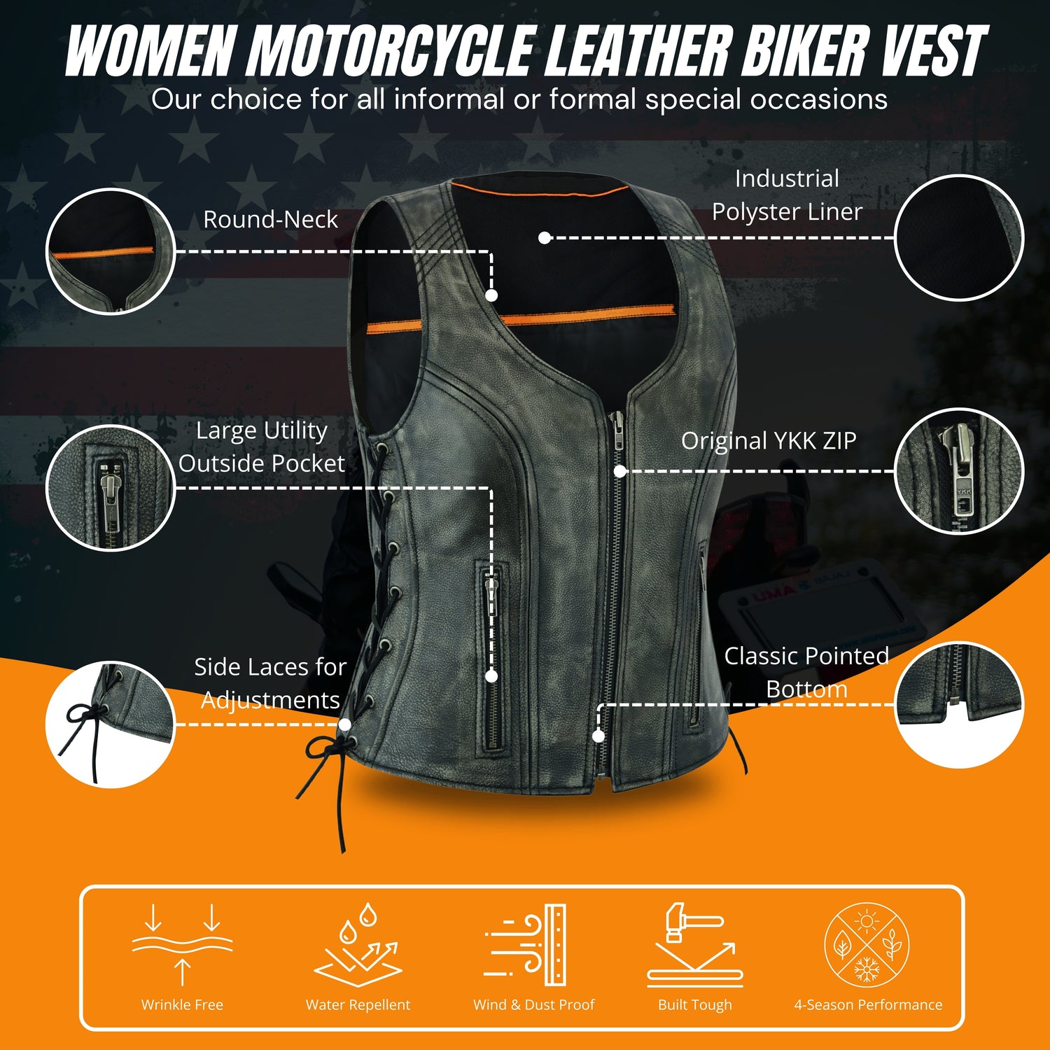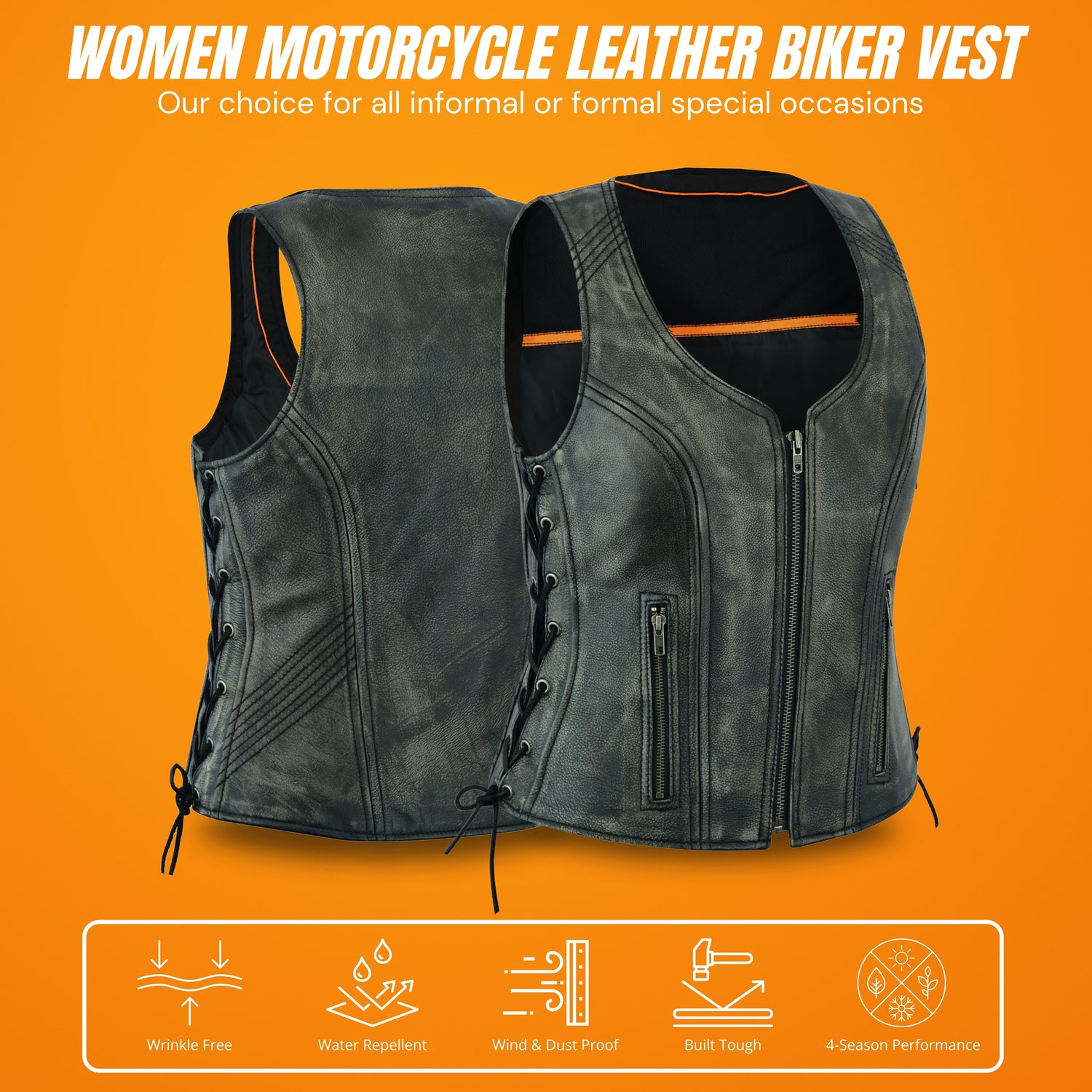 Women's Distressed Grey ‘Open Neck’ Motorcycle Side Laces Leather Vest - XS is backordered and will ship as soon as it is back in stock.