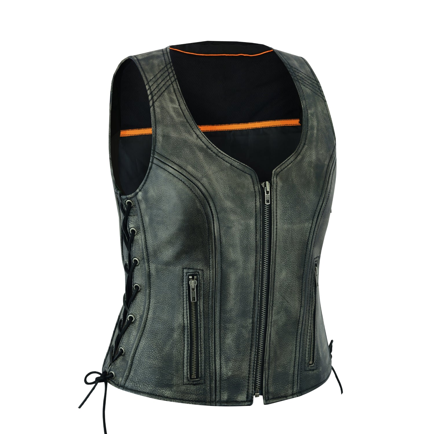WCWV13541GRAY | Route 66 - Women's Distressed Grey ‘Open Neck’ Motorcycle Side Laces Leather Vest