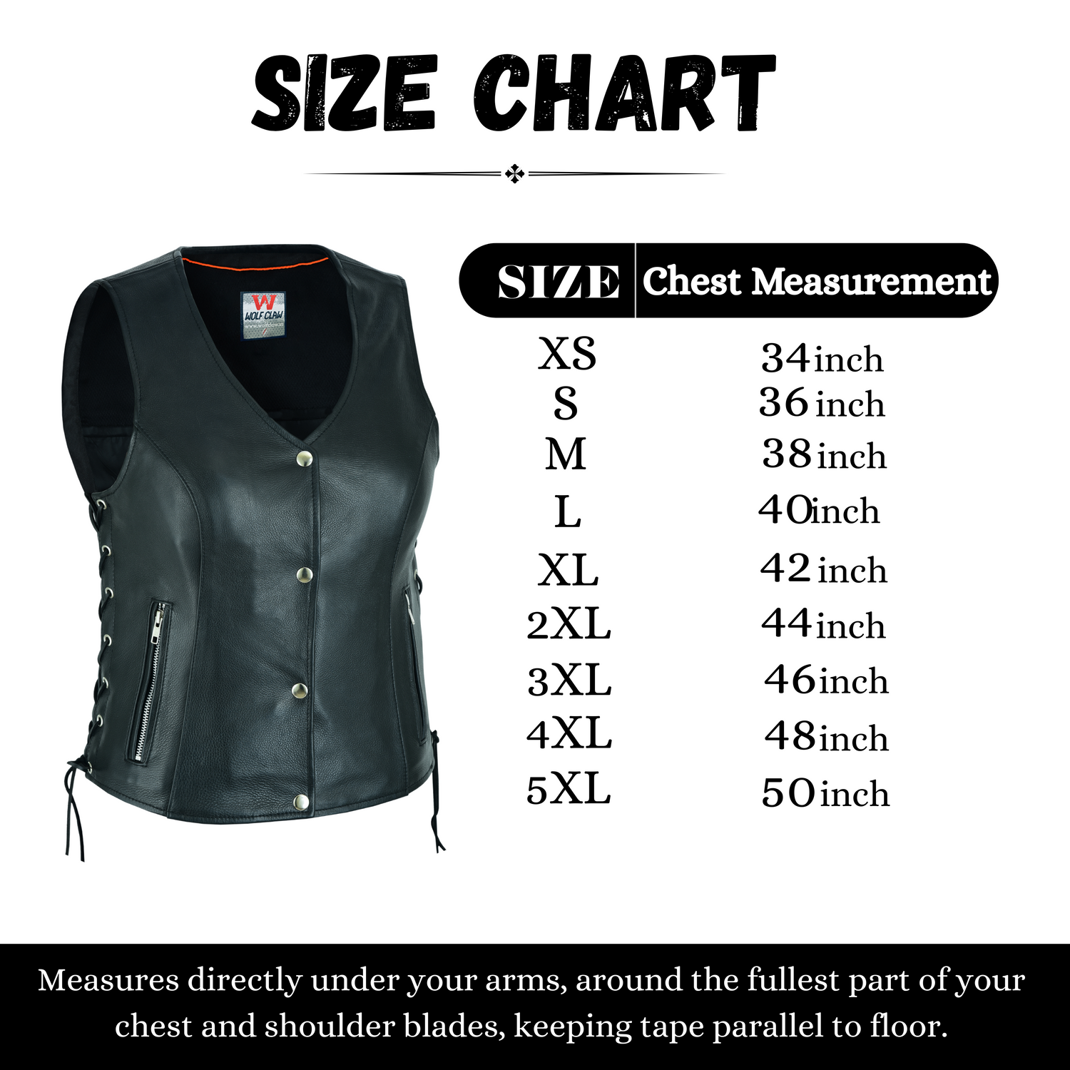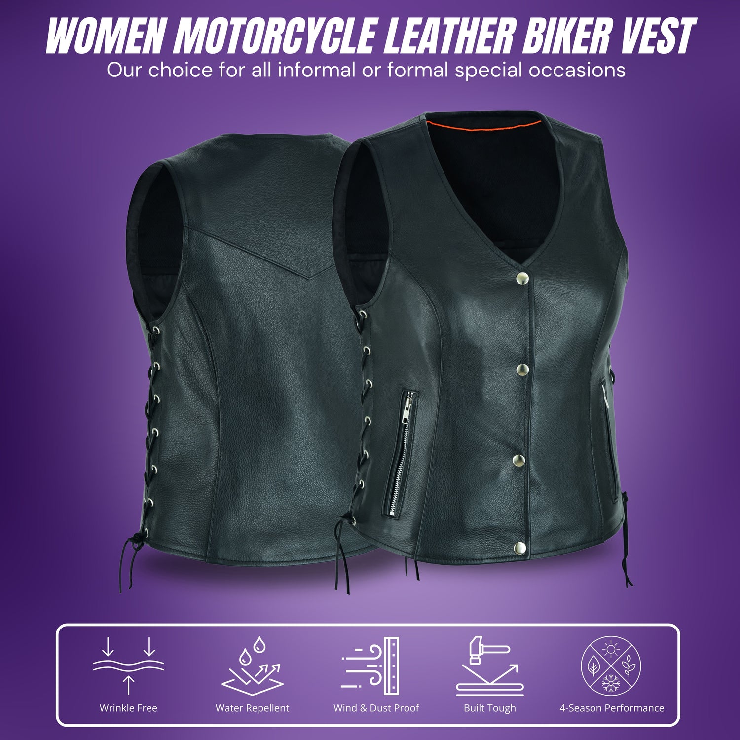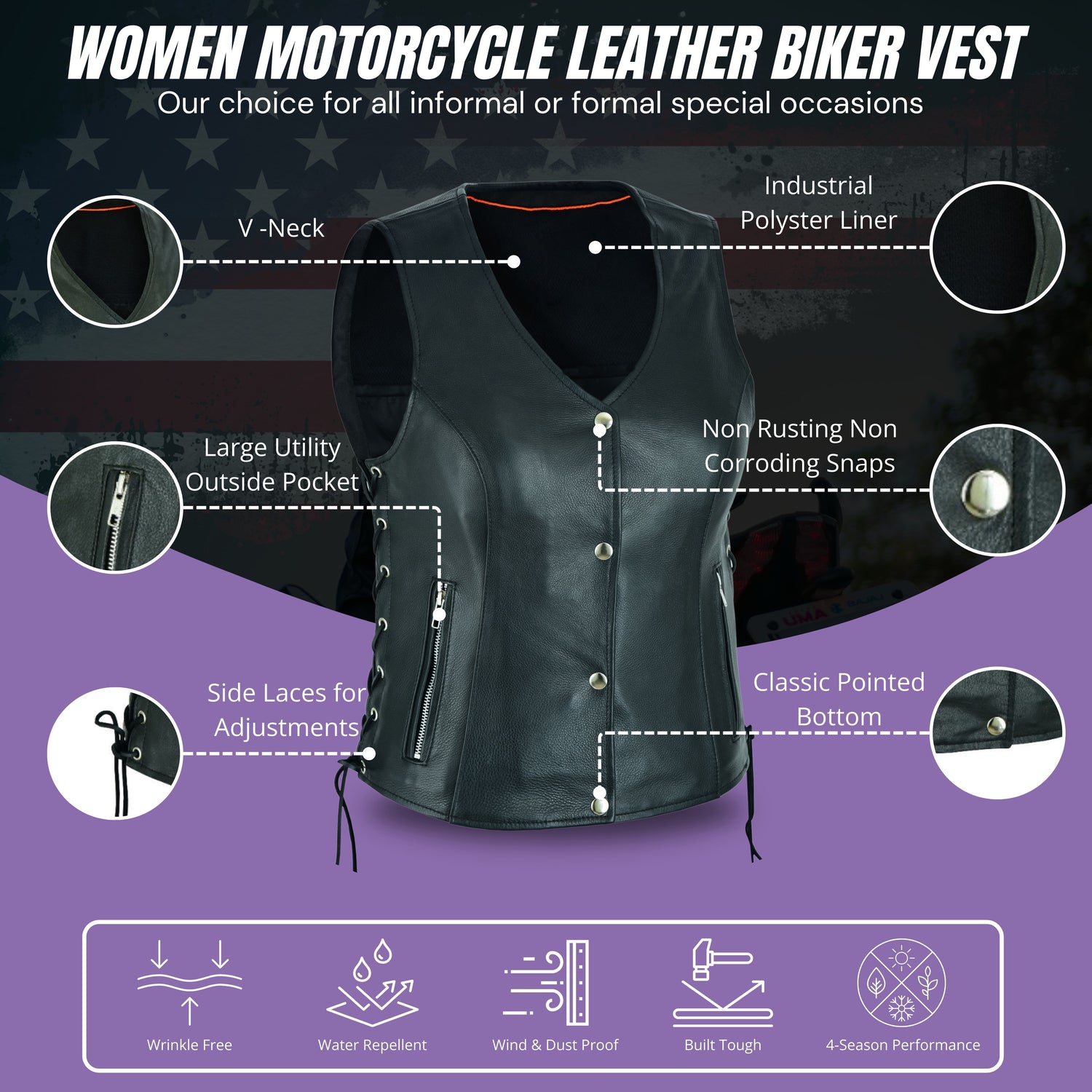 ✅ SIDE LACING BIKER LOOK: Lace up sides can adjust sizing that makes it perfect for wearing over a shirt or even a heavier jacket. Heavy duty Hardware, non rusting, non corroding snaps. Two outside zipper pockets.