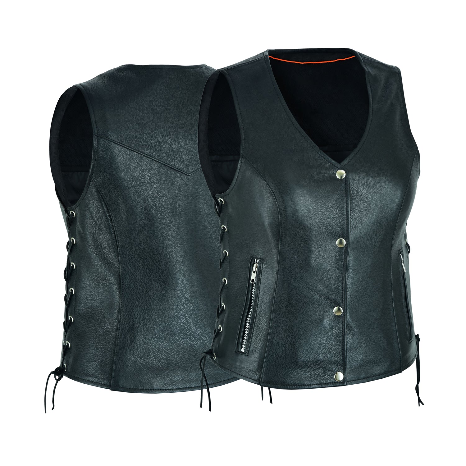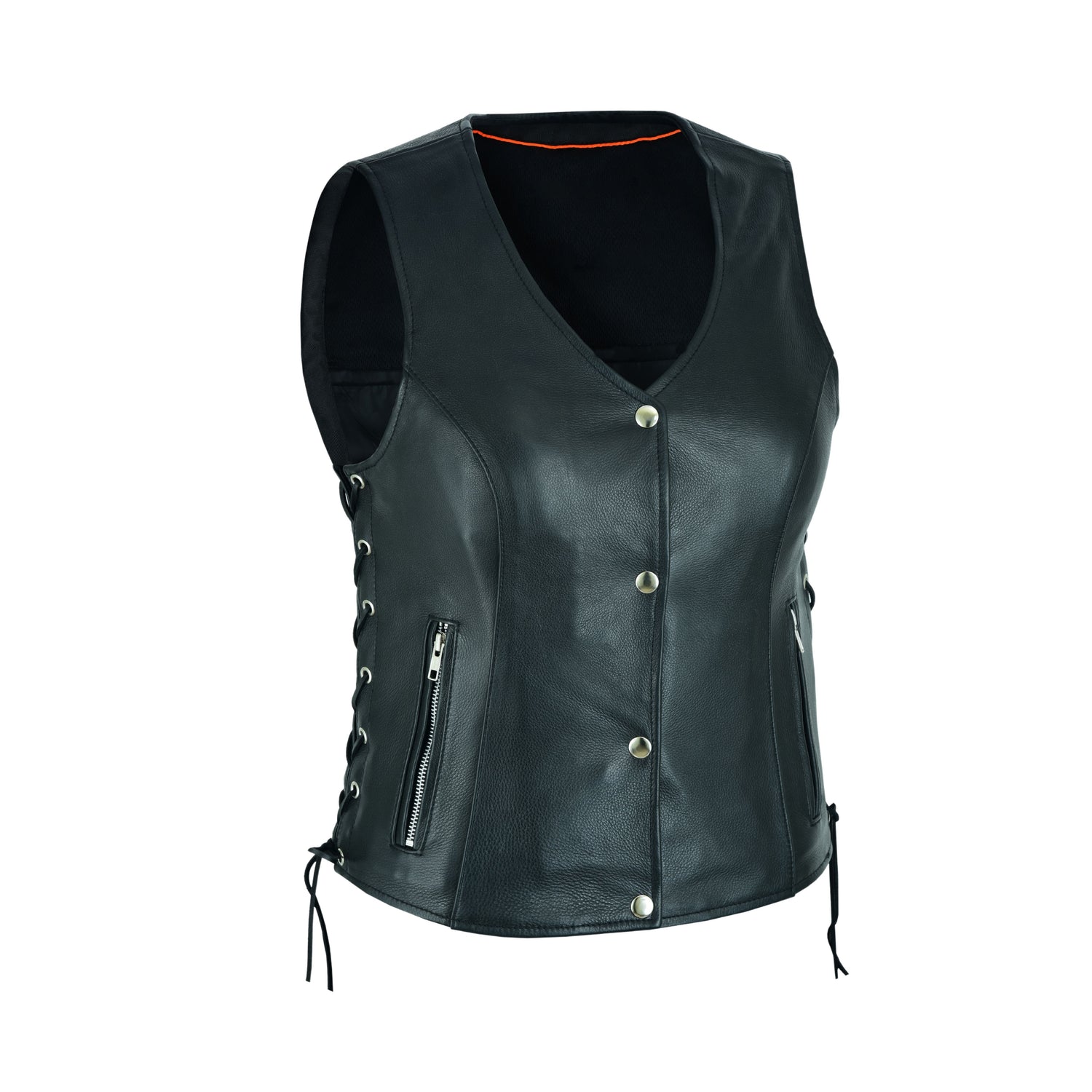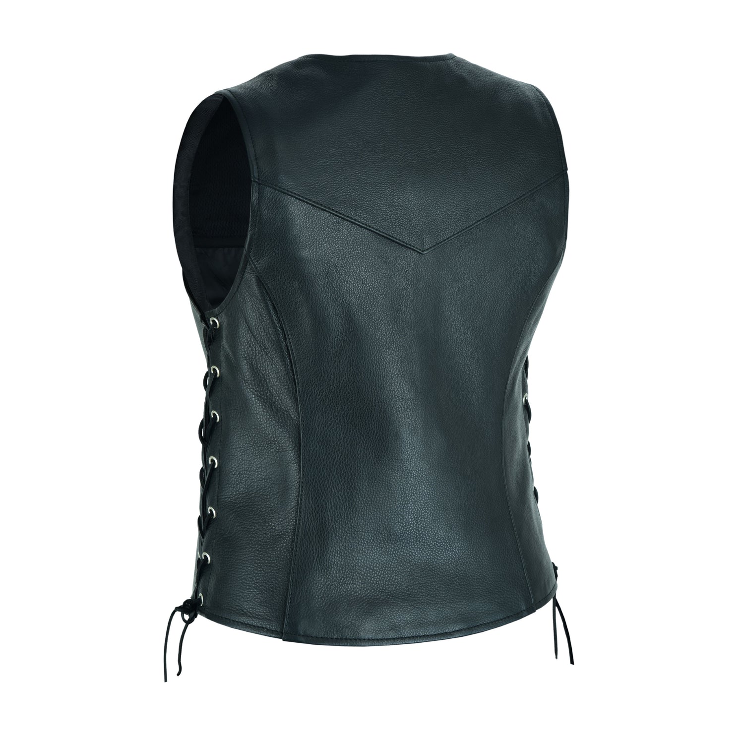 Leather vest...with side lace...need we say more? The Basic Leather Zipper Pocket Ladies Motorcycle Vest features high-quality leather construction with side lacing for an adjustable fit. Our women's leather motorcycle vest is styled with a V-neck that's begging for a scarf, pendant, or thin leather choker.