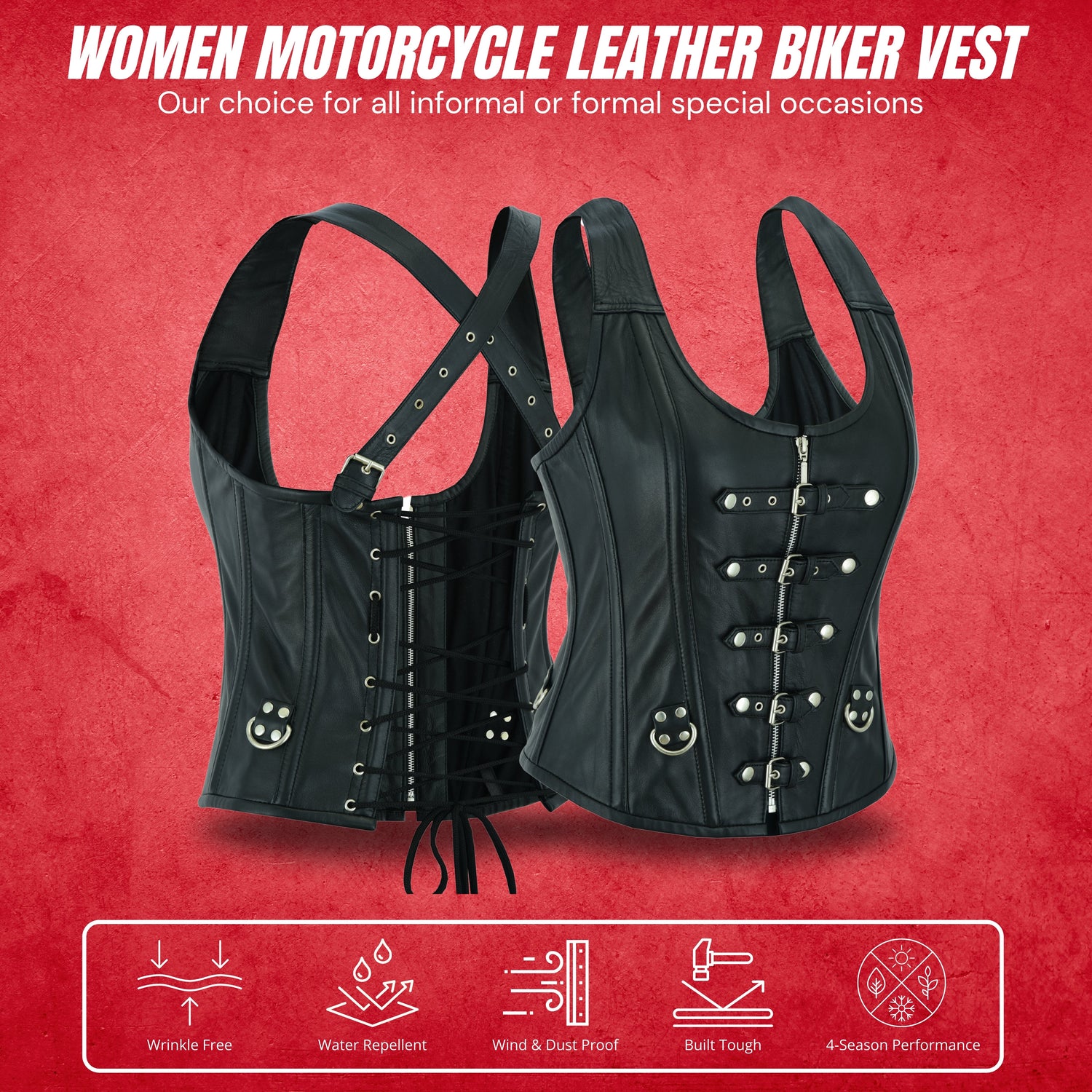 WCWV77041BLACK Bustier Halter Shoulder Straps Women's Steel Boned Gothic Punk Rock with Buckles Steampunk Corset Top Genuine Leather Clubwear