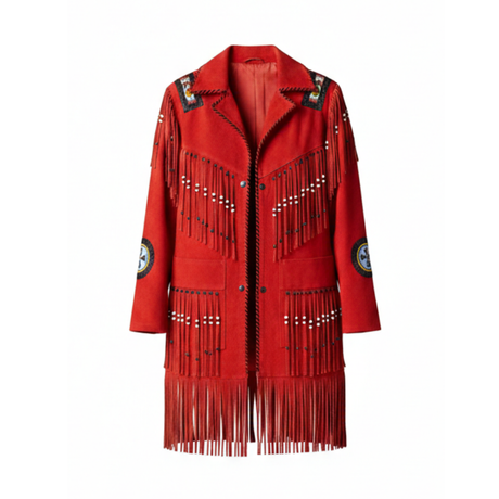 Women's Premium Red Suede Leather Native American Jacket – Fringed & Hand-Beaded Western Style