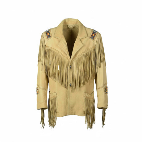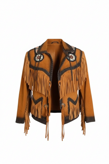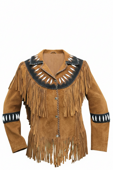 Women’s Native American Style Western Cowboy Suede Leather Jacket with Fringe & Beaded Details