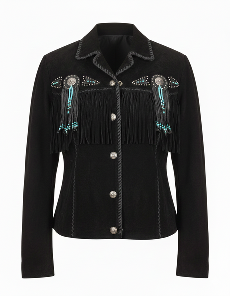 Women’s Native American Inspired Black Suede Leather Jacket with Fringe & Beads